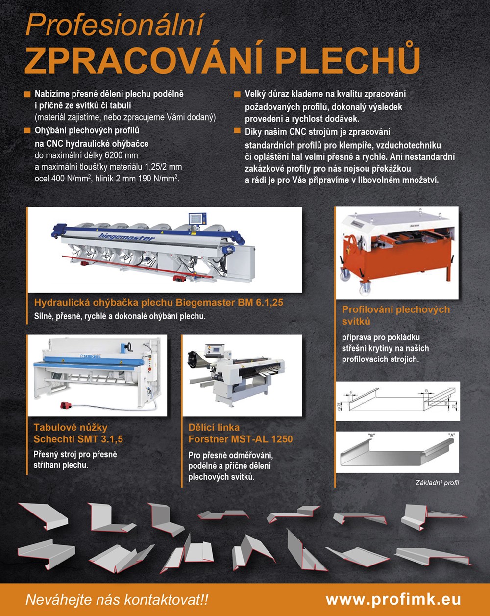 Díky těmto technologiím nabízíme kvalitní a rychlé zpracování plechu až do tloušťky 1,25 mm, včetně zakázkové výroby nestandardních profilů. Kontaktujte nás pro nezávaznou poptávku!
