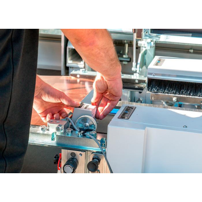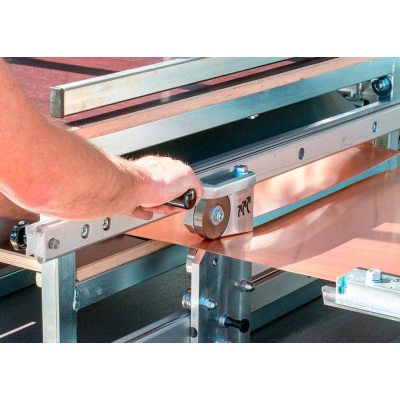 Pracovní stůl dílny je vybaven zařízením s kotoučovými nůžkami pro příčný střih. Na pracovním stolu lze nastavit požadovanou délku podle přiloženého měřítka. Velkoplošný pracovní stůl je možné prodloužit vysunutím konstrukce stolu.