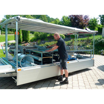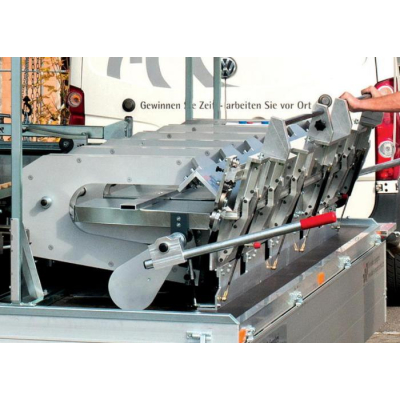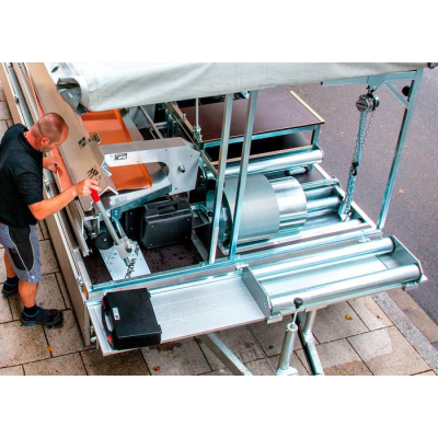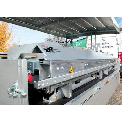 Na svislou konstrukci přívěsu lze umístit lehký kladkostroj pro nakládání a vykládání svitků cca do 300kg.Celá klempířská pojízdná dílna nabízí ještě další možnosti pro zpracování klempířských plechů. Především při výrobě fasádních panelů lze najít širokou nabídku tvarovacích zařízení.