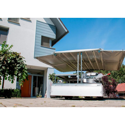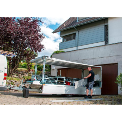 Díky dobře řešené konstrukci pojízdné dílny je možné jednoduchou manipulací vytvořit přístřešek a tím je možné pracovat téměř za každého počasí.