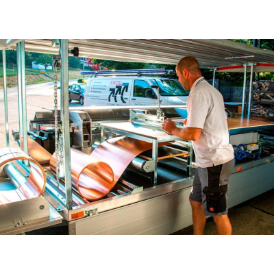 Vybavením dílny profilovacím strojem Schlebach MiniProf se klempířská dílna rozšíří o další možnosti a stává se tak plnohodnotnou dílnou. Pro úsporu místa je stroj zabudován v prostoru pod pracovním stolem. Při profilování se deska pracovního stolu odklopí a pro odkládání naprofilovaných plechů se vysune konstrukce stolu.